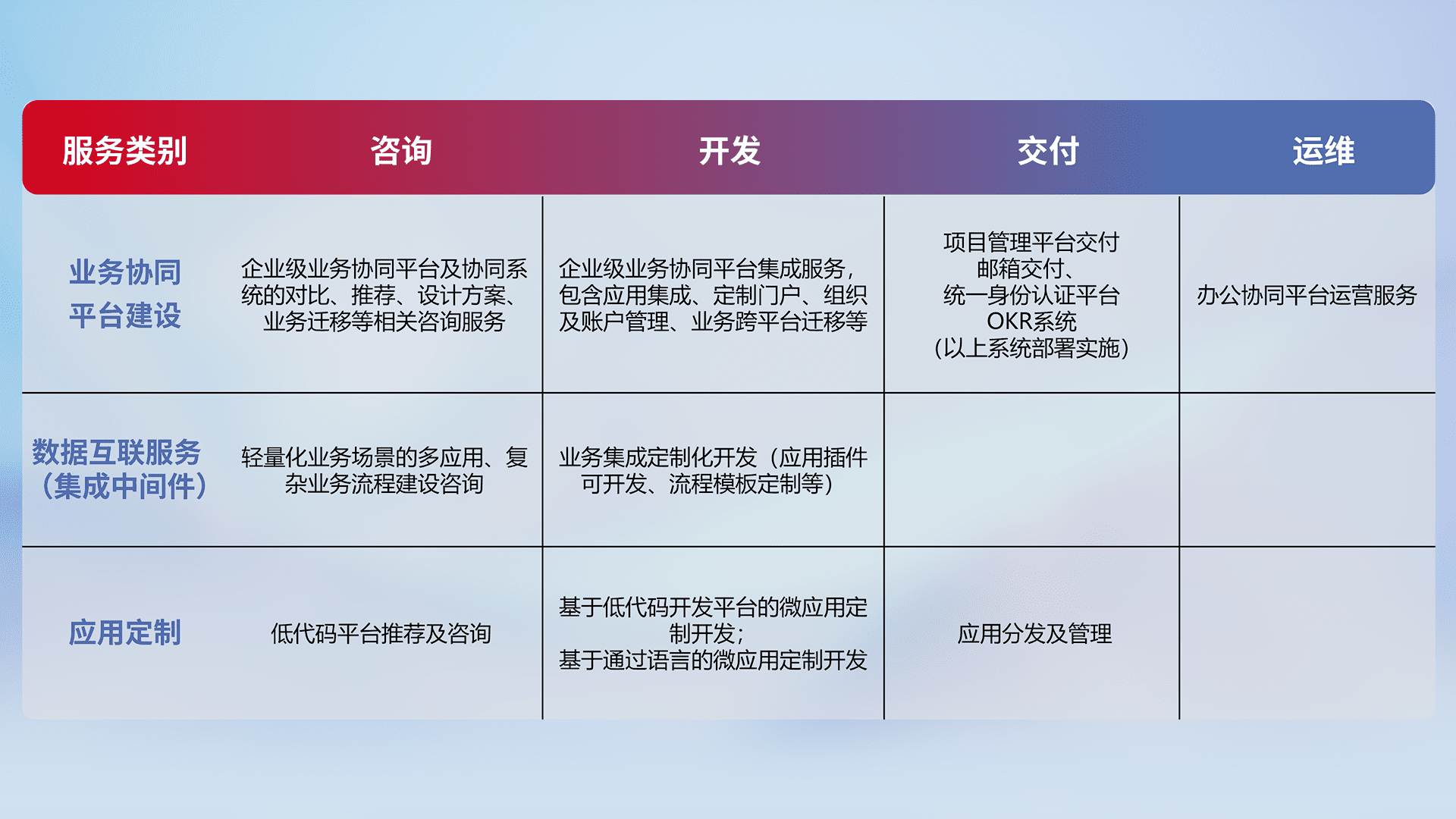 针对钉钉、、企微、、、IDaas等平台级产品提供产品的规划、、、、方案、、交付、、、定制化开发等服务,,,实现如统一协同办公、、智能客户服务、、、混合会议管理、、智能数据查询、、、、等业务场景,,,实现数字化转型。。。。