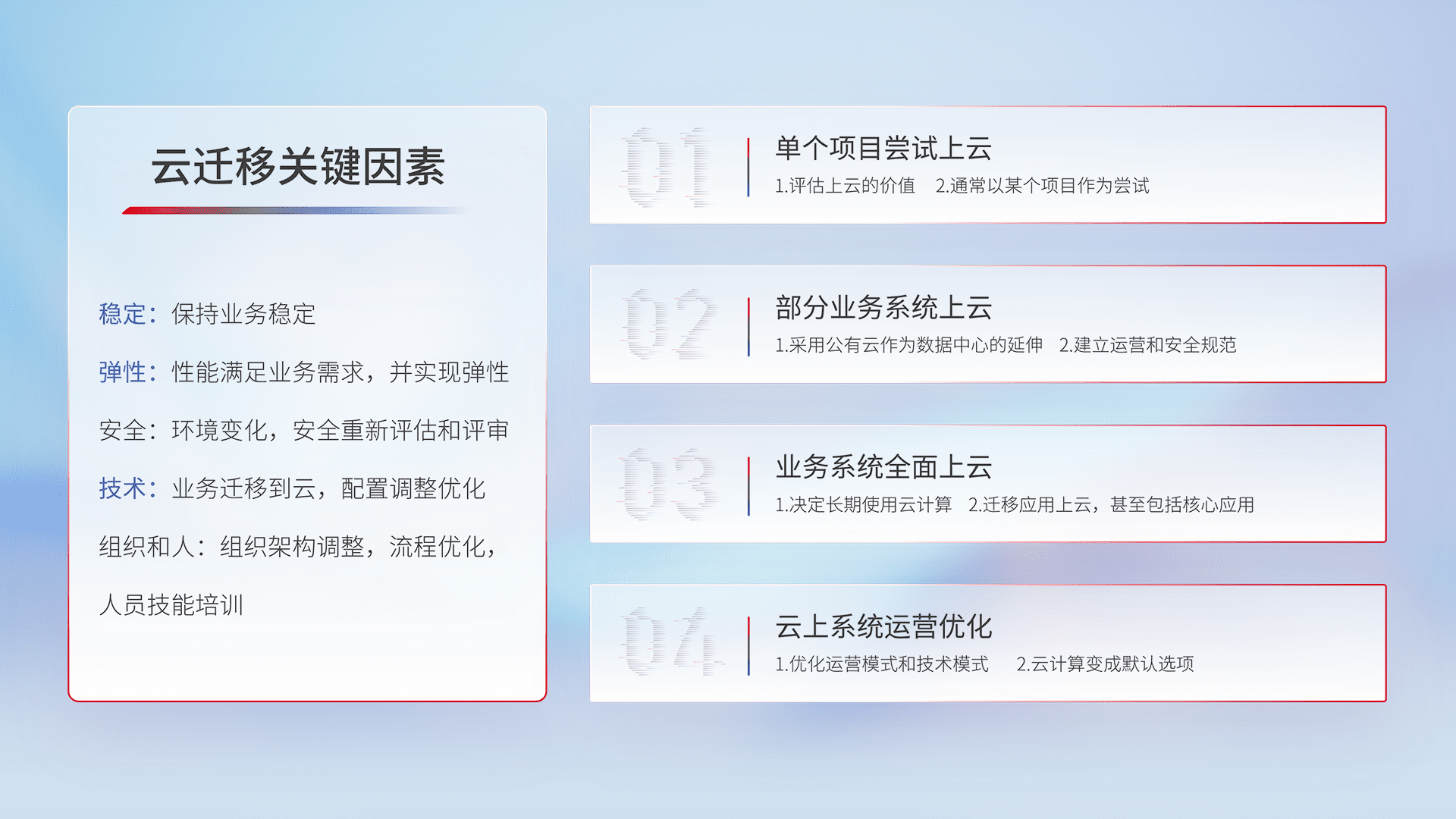 结合实际业务,,,从规划设计、、、、云平台选型、、、云原生改造、、数据迁移、、、集成交付,,迁移全过程为客户识别最佳上云路径,,做好风险识别管理,,,,设计网络架构、、、、身份权限、、安全审计合规、、、操作审计、、、日志审计、、监控告警策略、、多站点容灾设计等,,,,对云上基础设施进行整体规划,,,提升IT治理水平,,,以满足弹性、、、高可用、、、高性能的需求。。