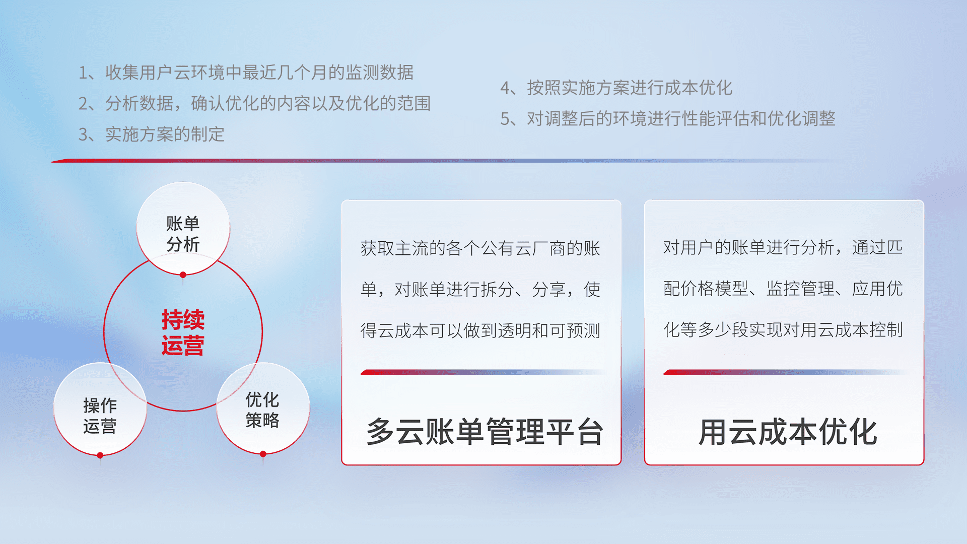 通过多云纳管,,以统一的资源数据模型把客户的云资源进行抽象和封装,,,进而实现对多云资源的统一操作,,,保障云资源管理的可靠性、、、稳定性与可用性。。量身定制化运维内容,,,,配置、、、、开发运维、、、补丁管理、、备份、、、、监控、、、认证和访问管理、、、审计和日常巡检等,,,保障在用云过程中的可靠度,,,稳定度以及高可用率。。